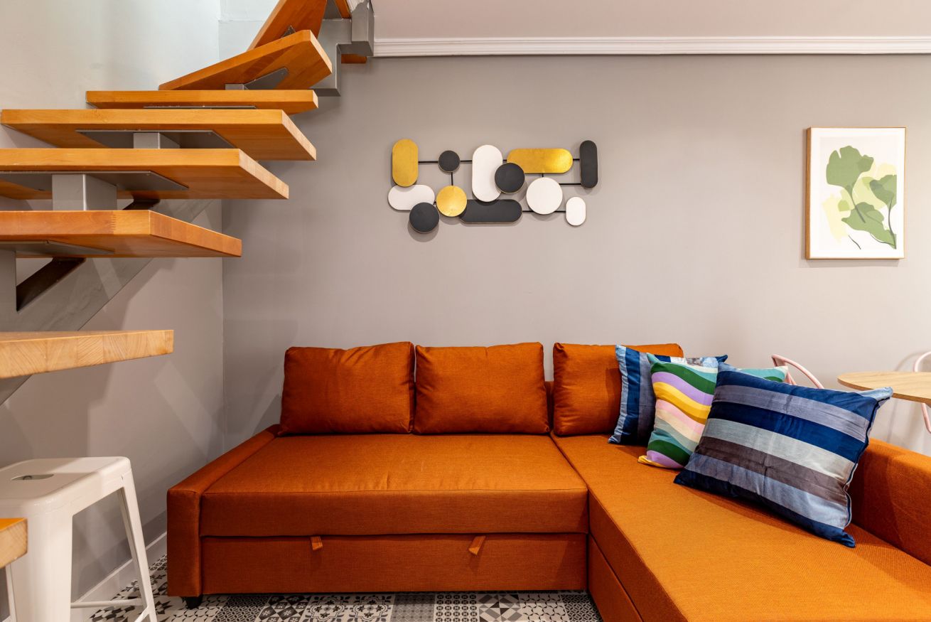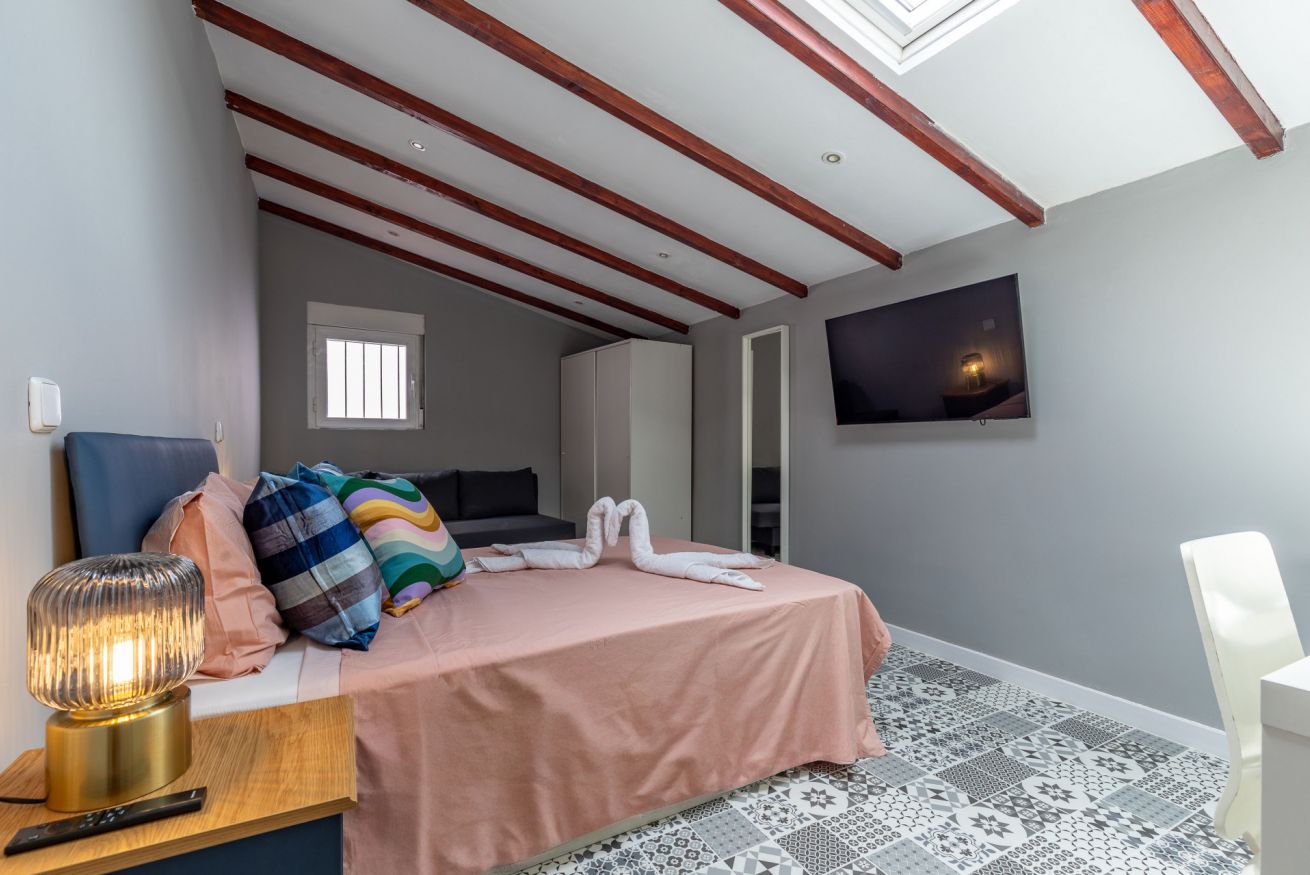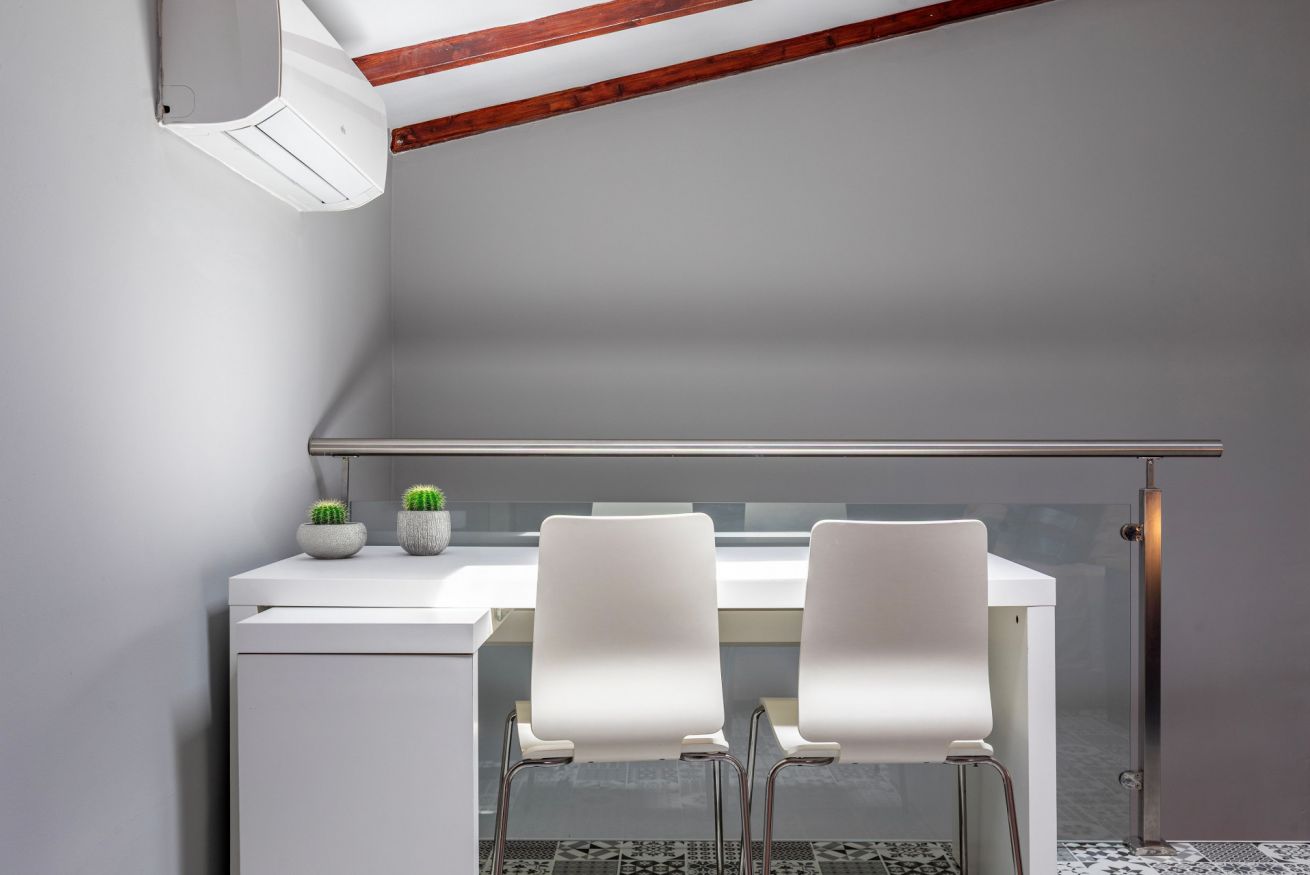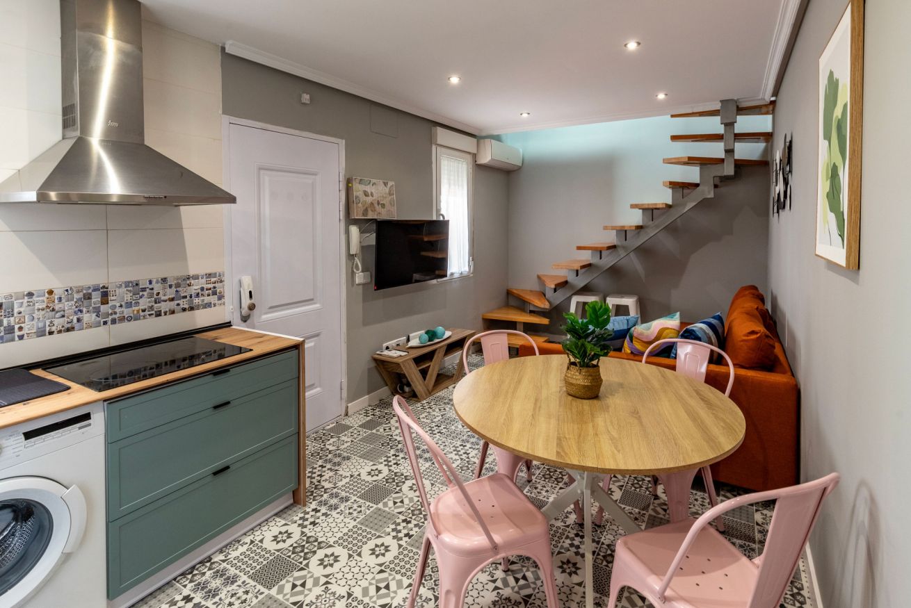 El apartamento es una preciosa vivienda-dúplex con decoración moderna, la habitación en la parte superior con acceso mediante una escalera. Dispone de cama de matrimonio, sofá-cama, armario y un escritorio como zona de trabajo. Con cocina tipo americana totalmente equipada y un moderno baño con ducha. Wifi, calefacción y Aire Acondicionado.